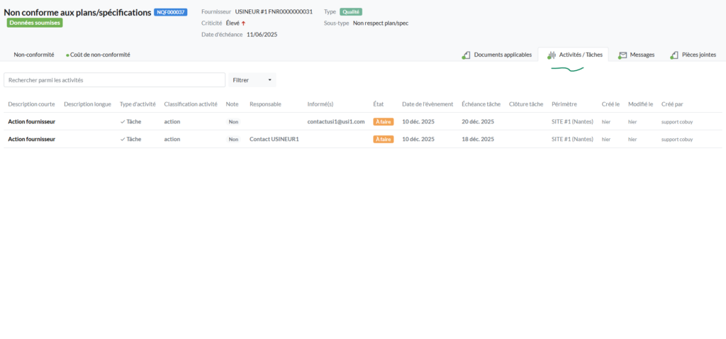Si l’émetteur de la non-conformité a créé des tâches pour lesquelles un contact de votre organisation est désigné comme responsable ou informé elles sont automatiquement partagées dans cet onglet dédié