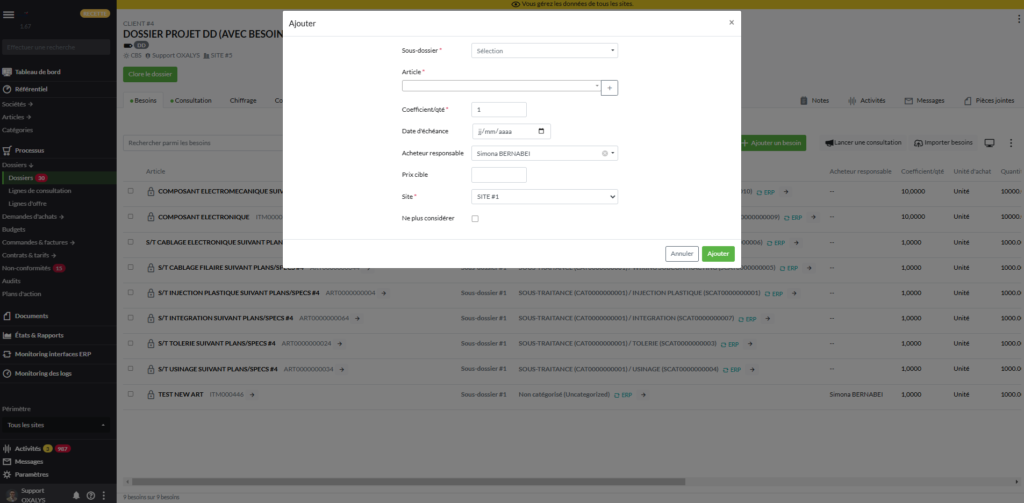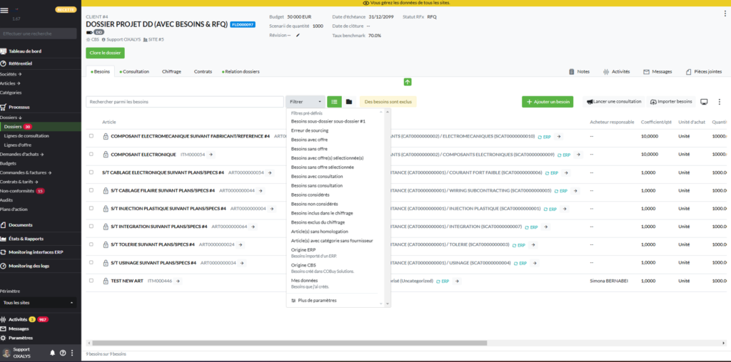 Cet onglet vous donne accès à la liste des besoins (articles) liés au dossier. Ils sont filtrables par sous-dossier
