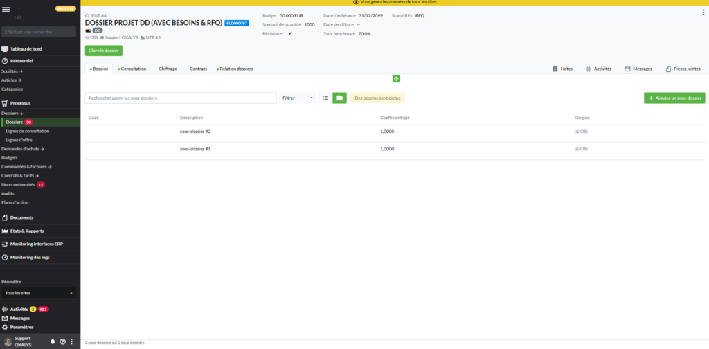 Les dossiers visent à lister des besoins, un besoin étant lié à un enregistrement de la base articles ( Gérer les articles). Un dossier peut être un projet, une affaire, un devis, une négociation, … le type de dossier est définissable par vos soins à partir des paramètres (Gérer les paramètres d’application). A partir des besoins d’un dossier vous pouvez créer et envoyer des consultations (Consulter les fournisseurs)