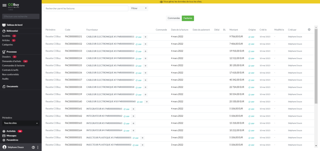 Une commande permet d’engager un ordre d’achats auprès d’un fournisseur. Vous pouvez déclarer si la commande a été accusée et la date accusée pour chaque ligne de commande et gérer les bons de livraisons (BL). Cette section peut également afficher les commandes et factures récupérées depuis votre ERP. Des commandes et lignes de commandes peuvent être créées à partir des offres sélectionnées.