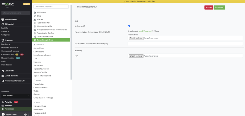 Concernant le SSO vous aurez besoin du support de votre service informatique pour l’activer. Ci-dessous la procédure de configuration du SSO (SAML2) :