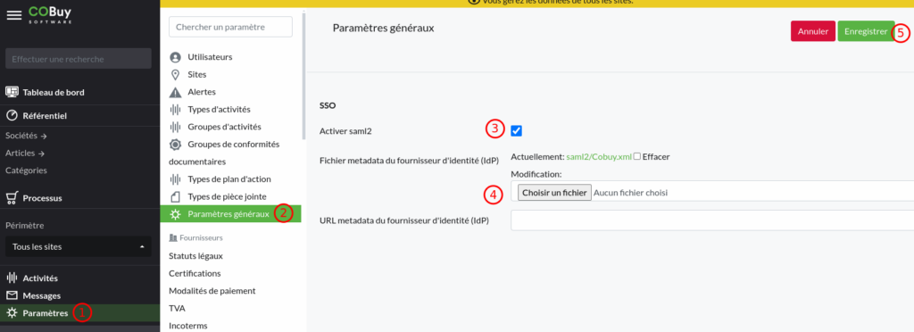 3- Depuis le menu Paramètres (1), puis dans le sous-menu Paramètres généraux (2), cochez l’option Activer SAML2 (3). Deux nouvelles entrées (4) apparaîtront. Vous pouvez renseigner :