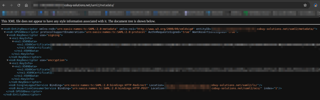 1- Pour obtenir les métadonnées de COBuy en tant que Service Provider (SP), il faut accéder à l’endpoint suivant : /saml2/metadata