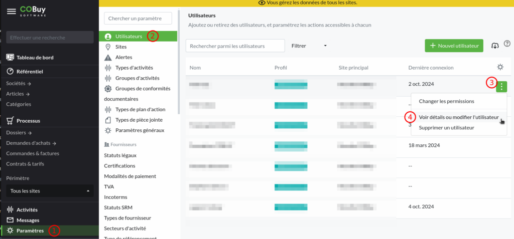 4- Pour autoriser l’authentification via SSO d’un utilisateur, depuis le menu Paramètres (1), puis dans le sous-menu Utilisateurs (2), dans la liste, cliquez sur les points de suite (3), puis sur Voir détails ou modifier l’utilisateur (4).