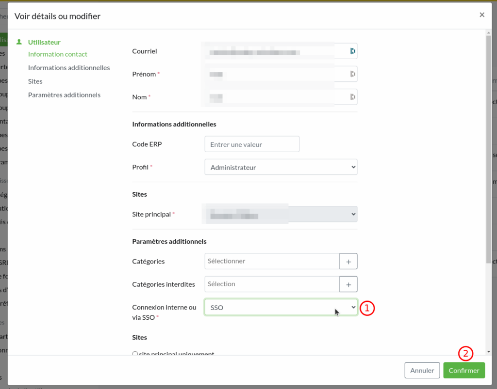 Dans le formulaire, dans la section Paramètres additionnels, sélectionnez SSO (1) dans le menu déroulant Connexion interne ou via SSO, puis cliquez sur Confirmer (2).