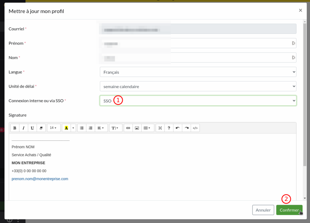 Puis, dans le formulaire, sélectionnez SSO (1) dans le menu déroulant Connexion interne ou via SSO, puis cliquez sur Confirmer (2).