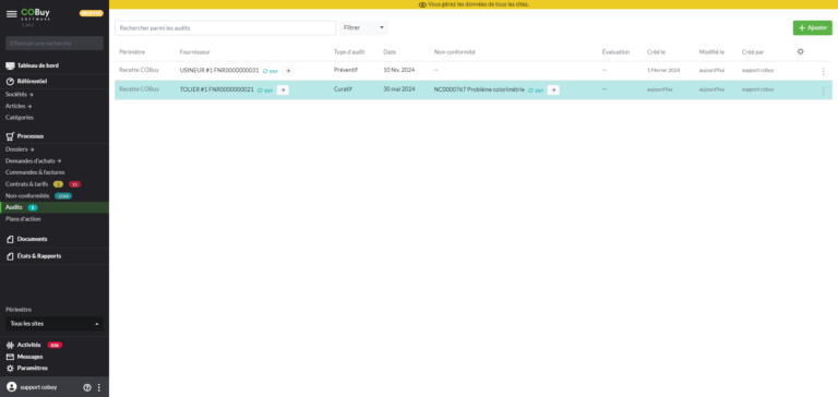 La gestion des paramètres qualité permet principalement de définir les types et sous-types de non conformité, les types de conformité documentaire, les critères et pondérations des critères d’une évaluation fournisseur (performances et risques), les niveaux de surveillance applicables aux évaluations, les types d’audit, …