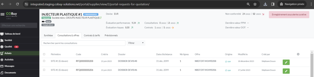 Evaluations > liste des évaluations permettant d’attribuer une note à votre compte fournisseur