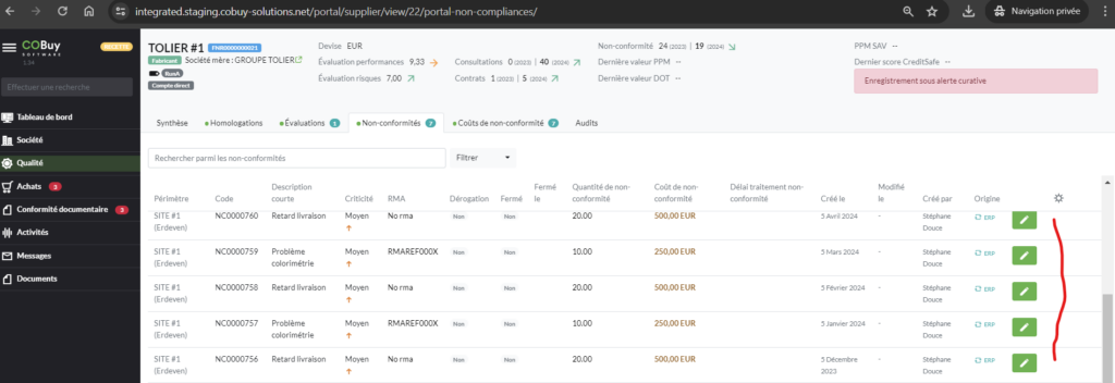 Informations : pour accéder aux détails d'un enregistrement (ex : non-conformité) cliquez sur le bouton vert situé complètement à droite de la ligne d'enregistrement les alertes préventives (échéance à venir) et curatives (échéance dans le passé) sont matérialisées par respectivement une étiquette "jaune" et une étiquette "rouge" une étiquette "bleue" identifie les nouveaux enregistrements dans une liste